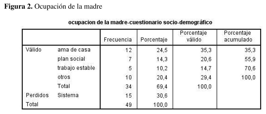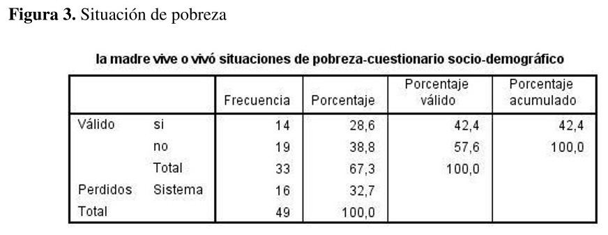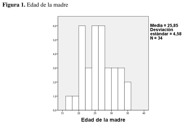 El promedio de edad de las madres es de 26 años, con una desviación típica de 4,5 años {ver figura 1}. La mayoría de las mujeres de esta muestra, un 35%, son amas de casa, seguida de otros, es decir, que un 29,4% son estudiantes o desocupadas, el 21% reciben un plan social y el 15% tienen un trabajo estable {ver figura 2}. Alrededor del 42% de las mujeres de la muestra percibe vivir o haber vivido situaciones de pobreza y el 58% no lo percibió {ver figura 3}.