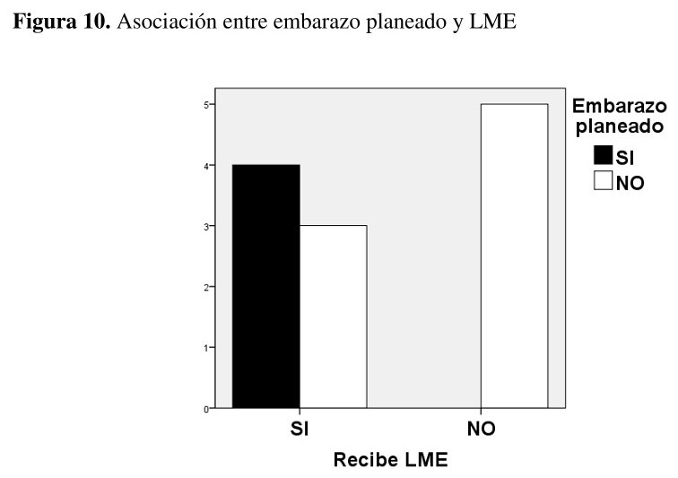 Se registra una asociación entre embarazo planeado y la lactancia materna. Las mujeres que planearon su embarazo alimentaron más a sus hijos/as con lactancia materna exclusiva que aquellas que no lo planearon (X2 (1, N=12) = 4,286, p < 0,03 {ver figura 10}.