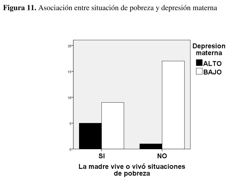 Se observa una asociación entre la situación de pobreza y la depresión materna obtenida tras aplicar el cuestionario PHQ-2. Las madres que perciben que han vivido o viven situaciones de pobreza presentan puntajes más altos en depresión (X2 (1, N=32) = 4,702, p < 0,03 {ver figura 11}.