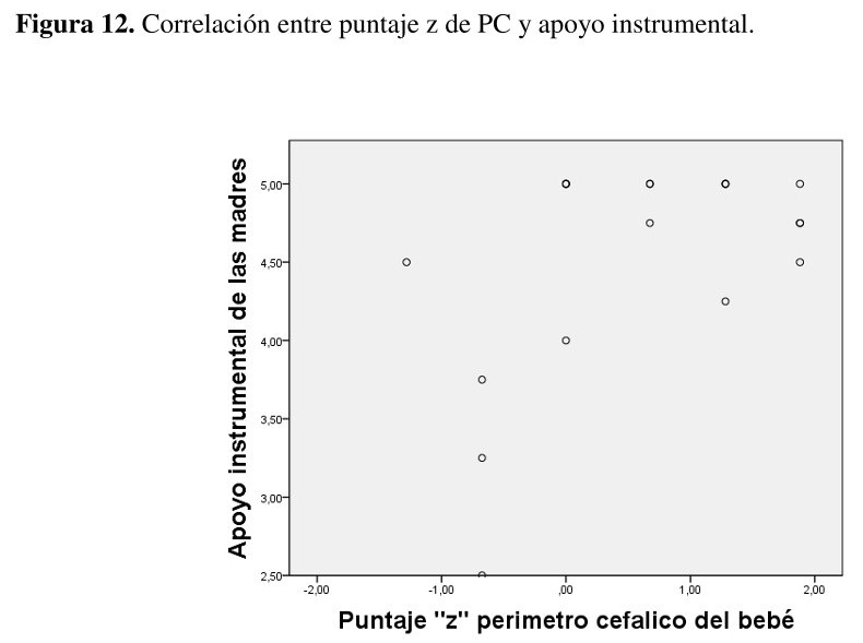 La figura 12 sugiere una tendencia hacia una correlación positiva entre el puntaje z de PC y apoyo instrumental, obtenido mediante el cuestionario MOS, aunque no se observa una relación estadísticamente significativa (r (19)= 0.377, p = 0,11 {ver figura 12}.