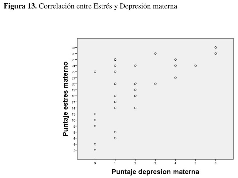 Se observa una correlación positiva estadísticamente significativa entre estrés y depresión maternos. Quienes obtuvieron mayores puntajes en depresión, mostraron valores más altos de estrés (r (33)= -2,882, p = 0,01 {ver figura 13}}.