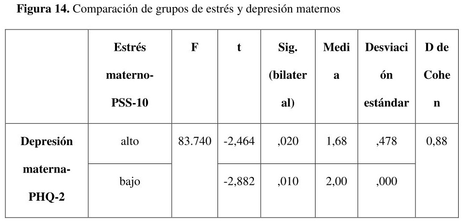 Una comparación de grupos entre madres con alto nivel de estrés y bajo nivel de estrés refleja una diferencia estadísticamente significativa para la variable Depresión (t(18) = -2,882, p = 0,01), por lo que aquellas mujeres que presentan niveles más altos de estrés, puntúan más en depresión {ver figura 14}.