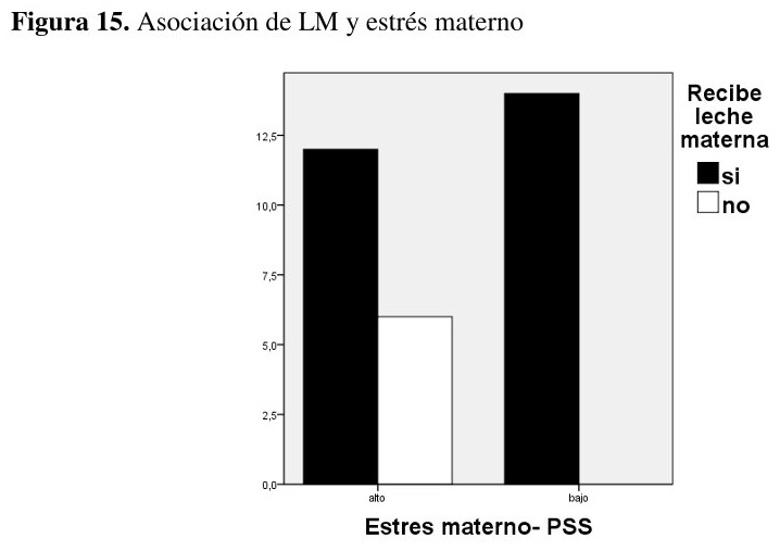 Se sugiere una asociación entre el estrés materno, medido con el cuestionario PSS-10 y la lactancia materna. Aquellas madres que obtuvieron altas puntuaciones de estrés, ofrecieron en menor medida lactancia materna a sus hijos/as. Estas impresiones fueron corroboradas con el análisis de chi cuadrado de Pearson, (X2 (1,N = 32) = 4,609, p < 0.032 {ver figura 15}.