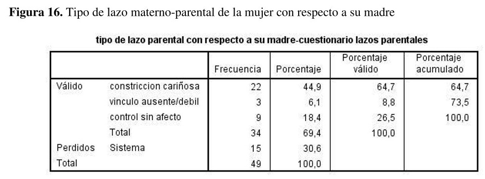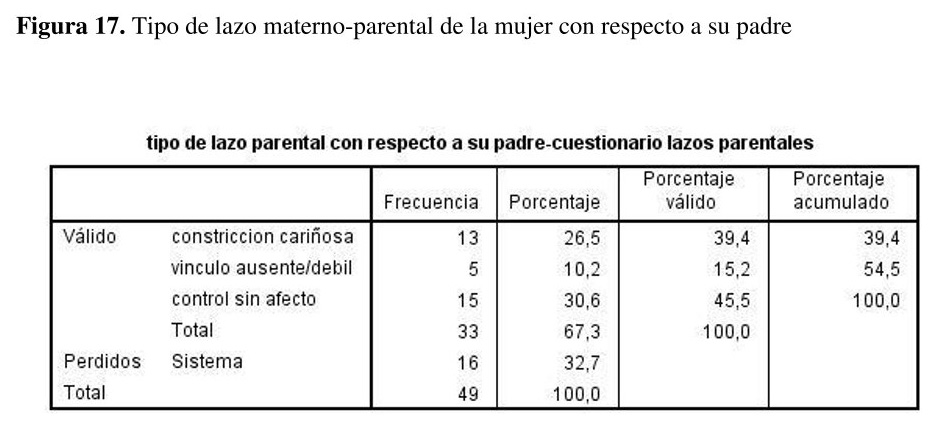 Hasta la edad de 16 años, el 45% de las mujeres presentó el tipo de lazo materno-parental 'control sin afecto' (alto en escala de sobreprotección-bajo en escala de cuidado), el 40% 'constricción cariñosa' (alto en escala de sobreprotección-alto en escala de cuidado), el 15% 'vínculo ausente/débil' (bajo en escala de sobreprotección-bajo en escala de cuidado) y el 0% 'vínculo óptimo' (bajo en escala de sobreprotección-alto en escala de cuidado) en relación con su padre {ver figura 17}.