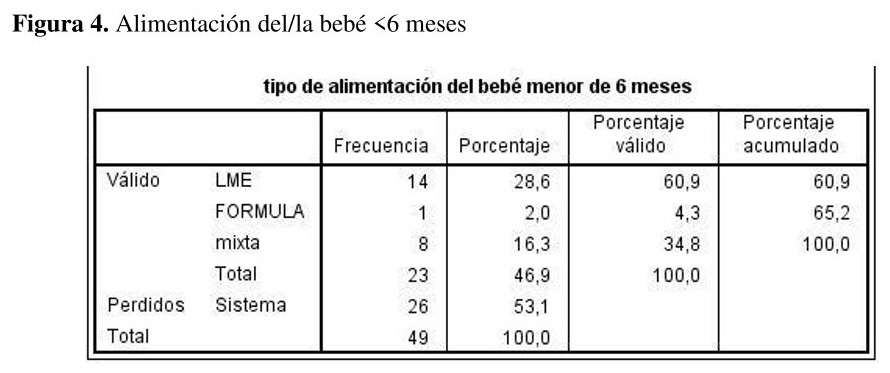 A partir de los resultados obtenidos en este estudio se observa que la prevalencia de lactancia materna exclusiva en los y las bebés de este estudio es alarmante, no alcanzando las recomendaciones de los organismos mundiales de salud. El abandono o no inicio de la lactancia humana dependen en gran parte de la situación económica y el estado emocional de la madre. Por el contrario, el nivel de apoyo social percibido por las madres de esta muestra es un factor que impacta de forma positiva en el sostenimiento de la lactancia materna.