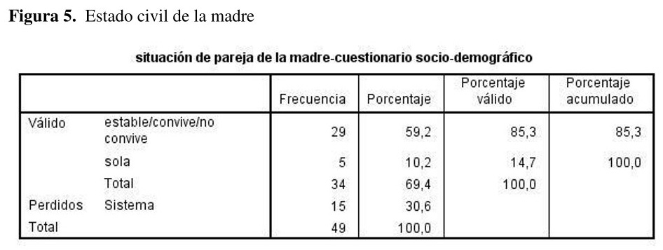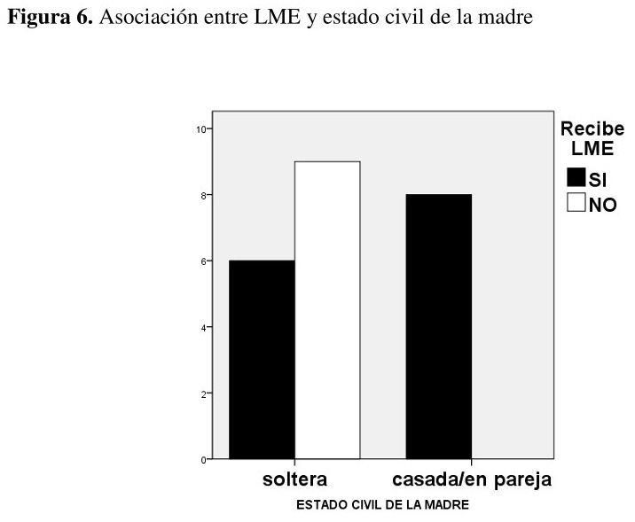 Se observa una asociación entre el estado civil de la madre y la lactancia materna exclusiva. Los/as niños/as de madres solteras reciben menos lactancia materna exclusiva que aquellos/as con madres casadas o en pareja (X2 (1, N =23) = 7,886, p < 0,005 {ver figura 6}.
