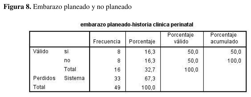 La mitad de las mujeres de la muestra habían planeado su embarazo y la otra mitad fueron partos no planeados, según la historia clínica perinatal {ver figura 8}.