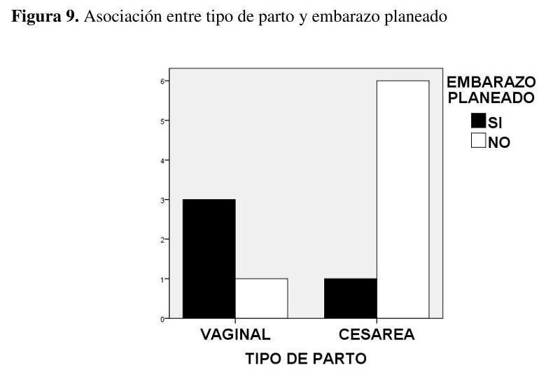 Se observa una asociación entre embarazo planeado y tipo de parto. Las mujeres que refirieron haber planificado su embarazo tuvieron mayormente un parto vaginal y quienes tuvieron partos no planeados, en su mayoría parieron por cesárea (X2 (1, N=11) = 4,055, p < 0,04 {ver figura 9}.